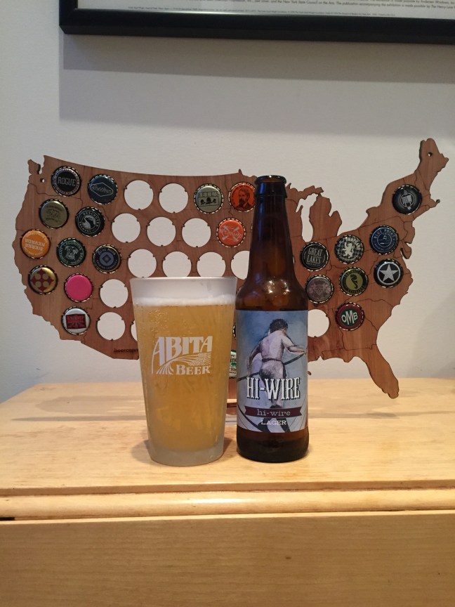 I had Hi-Wire Brewing Hi-Wire Lager a little while back at a friends house and I thought to myself that I should review this beer. I recently picked up Hi-Wire Lager at my local Harris Teeter grocery store. Hi-Wire Lager is brewed with light Pilsen malt & German hops that pours a bright yellow color with a bright two finger slowly fading white head with sweet aromas of Pilsen malts and a light grain note that is accompanied by a taste of a sweet malt flavor of light crispy grains that finish with a light crisp sweetness with a sweet bread like aftertaste that doesn’t stick around to long with a light mouth feel that is refreshing and smooth. When I first had this lager a while back it was great and still after having Hi-Wire Brewing Hi-Wire Lager it’s still good, getting an A. Hi-Wire Lager is a great craft lager and one that is very sessionable with ease of dinking. I highly recommend you try Hi-Wire Brewing Hi-Wire Lager and buy many it’s that good! Cheers! Please enjoy responsibly!