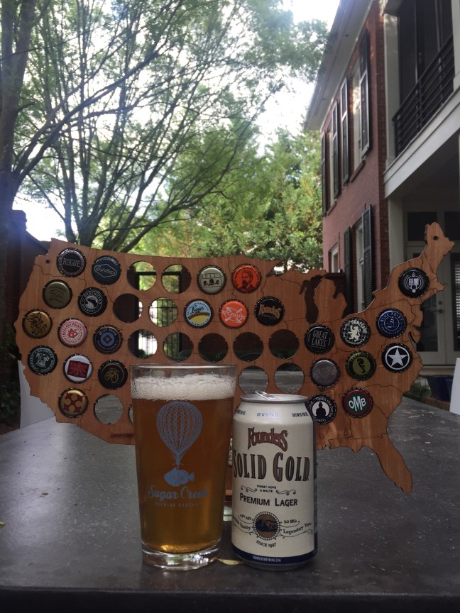 Founders Brewing Co. Solid Gold Premium Lager, 4.4% ABV and 20 IBUs is a relatively new beer from the Grand Rapids, Michigan brewer, and is part of a wave of craft lagers hitting the market recently. Solid Gold Premium Lager a canned beer that pours a clear golden hue with a fine two fingers white head that slowly creeps into somewhat nice lacing in the glass giving your nose crisp aromas of midwestern grains with a little faint hop note that lead a taste of light refreshing crisp flavor of light malts with a bit hop a hoppy corn note towards the back of your tongue with a nice crisp refreshing gain like finish that followed by a faintly hoppy yet crisp aftertaste all with a light mouthfeel. This is a quite easy drinking beer. You can sit and have several with out wrecking your palette. But I have had lagers that’s are a bit better, so Founders Brewing Co. Solid Gold Premium Lager receives a C+. It’s slightly better than just average and it’s no Budweiser, Miller, or Coors beer. It’s definitely a craft lager. Cheers! Please enjoy responsibly!