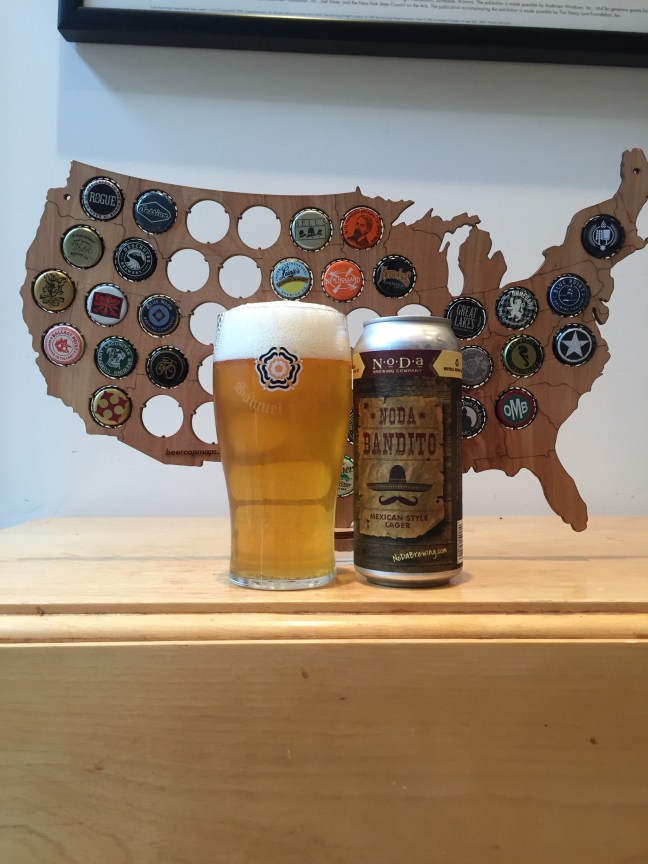 Craft brewers have been brewing the Mexican style larger for a while now and are a somewhat popular style among beer drinkers. This NoDa Brewing Company Bandito Mexican Style lager, 4,9% ABV is on the trend and is brewed with flaked maize, otherwise known as corn. Bandito pours a golden color with a fluffy two and a half finger white head with a slow fade into some nice lacing in the glass that gives you corn aromas with some sweetness that is a little similar to a Corona that takes you to a Corona like tasting sweet clean corn flavors with a nice clean yet semi-sweet finish and a much similar aftertaste with a faint dryness lingering till the next sip with a light refreshing mouthfeel. I was surprised at how much it tasted like a Corona and how well it was brewed to the Mexican style lager. I give NoDa Brewing Company Bandito Mexican Style lager an A-. It loses just one because as it warms it become a little off and not as good as it is at the first taste, but still a good be otherwise and yes you can have a six-pack without destroying your taste buds. So go and try NoDa Brewing Company Bandito Mexican Style lager I recommend that you do. Cheers! Please enjoy responsibly!