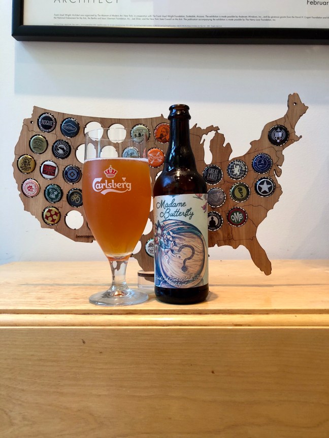 Haven’t reviewed much of The Unknown Brewing Company’s offerings, but I saw Madame Butterfly French Oak Tart Blonde Beer, 5.8% ABV. Madame Butterfly is a blonde ale aged in French Oak barrels and pours an orange color with a half finger clear fizzy head that fades into itself as quickly as it can with aroma of white wine fruits, some apples, pears, and green grapes with hints of soft vanilla that take you to a tart white wine flavor of apples, pears and nice green grapes with hints of nice soft vanilla that is tart enough without puckering your mouth with a nice tart but lightly fruity sweet finish and soft tart white wine aftertaste with a medium mouthfeel. The Unknown Brewing Company Madame Butterfly is a good beer and one that I a wine drinker would enjoy. It is much like a white wine. I give Madame Butterfly and A-, just could not t have two or more pints of Madame Butterfly’s flavor becomes overwhelming on your taste buds, but otherwise, this is a good beer. I recommend trying The Unknown Brewing Company Madame Butterfly French Oak Tart Blonde Beer. Cheers! Please enjoy responsibly!