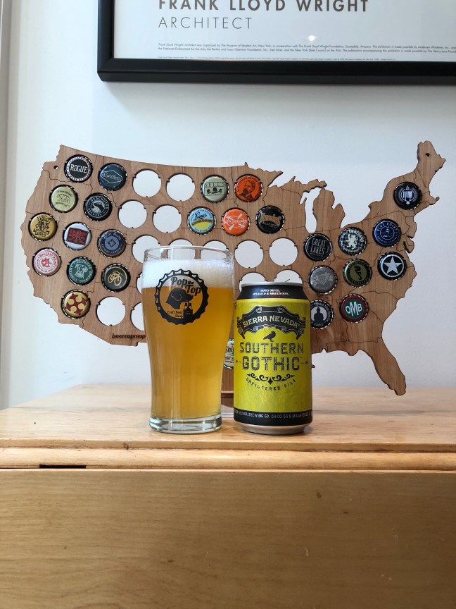 Sierra Nevada Brewing Co. Southern Gothic Unfiltered Pilsner, 5.2% ABV, another local grocery store find is somewhat of a new beer from Sierra Nevada Brewing Co. and it’s sort of follow a trend where Brewers are not filtering their beer especially IPA. Southern Gothic Unfiltered Pilsner pours a hazy slightly clouded golden color with a two and a half bright white head that slowly dissolves and gives off a semi-sweet sour bread and light malt notes that take you into a flavor of a semi-sweet breaded flavor with some chalk like flavors and the flavor becomes sours as it warms with a faintly bitter finish with a chalky aftertaste that slips into a very faint bitterness. This beer isn’t that good I give Sierra Nevada Brewing Co. Southern Gothic Unfiltered Pilsner a D+. I was hoping for a better beer from Sierra Nevada Brewing, this was a letdown and yes it’s not so bad that you can’t finish it. Maybe the Pilsner style isn’t a beer that should be unfiltered. I just don’t think I would hurry back to Sierra Nevada Brewing Co. Southern Gothic Unfiltered Pilsner nor would I recommend it! Cheers! Please enjoy responsibly!