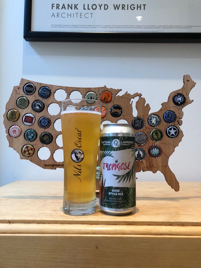 Captain Lawrence Brewing Company Tropigose Gose Style Ale, 4.5% ABV is another beer in my recent mixed six pack from Whole Foods and is brewed with passion fruit and guava. This Captain Lawrence Brewing company from Elmsford New York pours a Golden color with a two and a quarter white head that fades into a nice halo giving off tart tropical fruit notes with a slight bit of sour to it that take you down to a flavor or tart tropical fruits such as passion fruits front with a little melon in the middle that are nicely tart with hints of sour notes with a nice tart passion fruit finish and a nice tart fruited aftertaste that lingers with a hint of sour fruit with a light mouthfeel. Captain Lawrence Brewing Company Tropigose is a good beer but not enough passion fruit nor is they any trace of guava fruit, if you put that on the can then I think there should be enough to make it so, and I give this beer a B-. It not a bad beer for a Gose style ale but it just misses the amount of fruit flavor. It needs just enough to let you know its in there and yes I recommend Captain Lawrence Brewing Company Tropigose. It’s good otherwise! Cheers! Please enjoy responsibly!