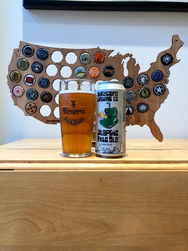 Birdsong Brewing Co. Jalapeño Pale Ale, 5.5% ABV is one of my favorite local Charlotte beers and I have thought to myself while enjoying it that I probably should give it a review, well here I am giving you that review. Jalapeño Pale Ale starts out with a base of Birdsongs Free Will Pale Ale, which I should review, then they use whole Jalapeños without the seeds, seeds are where the heat or spice is contained, the idea or flavor profile that Birdsong is going for is a pale ale with jalapeño flavor without the heat that comes along with it. Jalapeño Pale Ale pours slightly deep yellow almost gold color with a one finger tight head of white foam that dissipates into some quite nice lacing with hot pepper aroma with some faint bitter notes coming in behind the heat that take you a spiced heat flavor up front that is bitter in the middle of mouth with some heat notes that continue to the back of the mouth that all finish with a bitter heat with a bitter heat/spice finish with a light mouthfeel. Jalapeño Pale Ale’s heat flavor are not spicy they are more of a pepper warmth or heat like quality and goes well with the smooth bitter pale ale that is ever bit of an A+, and one beer that I recommend. I will say that I probably could only drink about three to four pints of this before the flavor overwhelms my taste buds, but its a good beer to have while enjoying a meal or watching a sporting event. Cheers! Please enjoy responsibly!