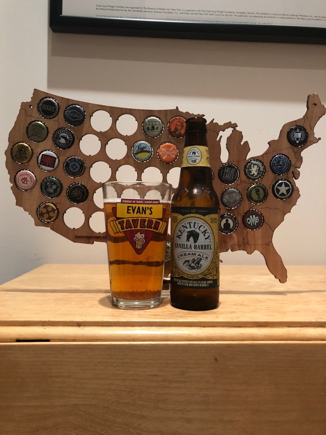 Kentucky Ale Kentucky Vanilla Barrel Cream Ale, 5.5% ABV pick up from Total Wine, is brewed in Lexington Kentucky and is 100% barrel aged. Kentucky Vanilla Barrel Cream Ale pours a clean orange color with a one finger fizzing white head with sweet vanilla aroma with thin barrel oak that guides you into a sweet vanilla taste that washes quickly of your tongue with hints of a smooth sweetness with a lingering finish of vanilla that is soda like and a much similar aftertaste that lingers with vanilla with a medium mouthfeel. Kentucky Vanilla Barrel Cream Ale has lots of sweet vanilla to it with very little barrel notes and I think its C-. The sweet vanilla flavor hold the beer to be average but not great. This beer has more of a vanilla soda like quality to it that is okay at best and I don’t think I would hurry back to have Kentucky Vanilla Barrel Cream Ale again! Cheers! Please enjoy responsibly!