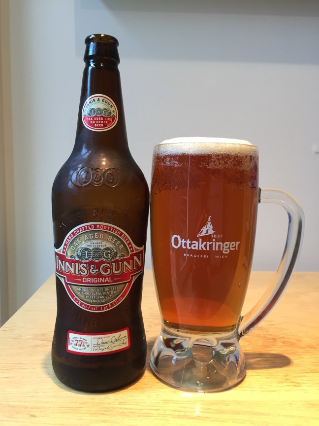 Here we have an import beer from Scotland, Innis & Gunn Original Oak Aged Beer, 6.6% ABV. This beer is aged in an oak barrel for seventy-seven day before bottling. This Innis & Gunn pours a caramel color with a one finger white fizzy head that fade kind of quickly. The aroma is sweet with hints a light vanilla and caramel with a faint toasted oak note. Original Innis & Gunn does have a sweet start to the taste, with a slight vanilla and some caramel notes then you get a bit of toffee in the middle with the oaky flavor towards the end. The finish is smooth yet semi-sweet with a nice lingering after taste of vanilla toffee. Not a bad oak aged beer; I give this one a B+. You can really taste how the aging really smoothed out the beer, usually, this Scottish style is a bit harsher but this one isn’t, it’s mellow and smooth with a nice subtle sweetness. I recommend trying Innis & Gunn Original Oak Aged Beer. It’s a nice beer. Cheers! Please enjoy responsibly!