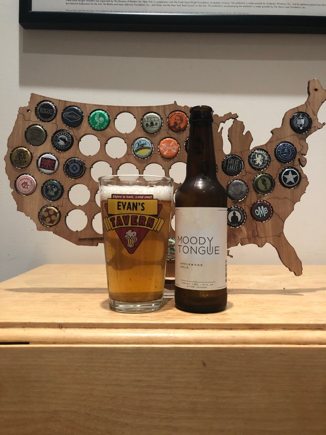 This Moody Tongue Brewing Applewood Gold, 5.0% ABV is only the second beer I’ve had from Moody Tongue, this is a lager brewed with applewood in Chicago Illinois. Applewood Gold pours a golden color with a quickly fading two finger white head giving off a faint smokey biscuit aroma that leads into a biscuit flavors on the front of the tongue with a little faint fruit note on n the middle and a bit of smoke on the back that really builds in the finish with a big lingering aftertaste of smokey bacon with a light mouthfeel. This Applewood Gold is like drinking an Applewood bacon sandwich on a biscuit, but the flavors don’t seem to go together well, but individually they are good but this Moody Tongue Brewing Applewood Gold is a D+. On paper a lager brewed with applewood sound good but doesn’t hit the mark as a beer, it’s a lager then a smoke beer but it’s not both. Cheers! Please enjoy responsibly!