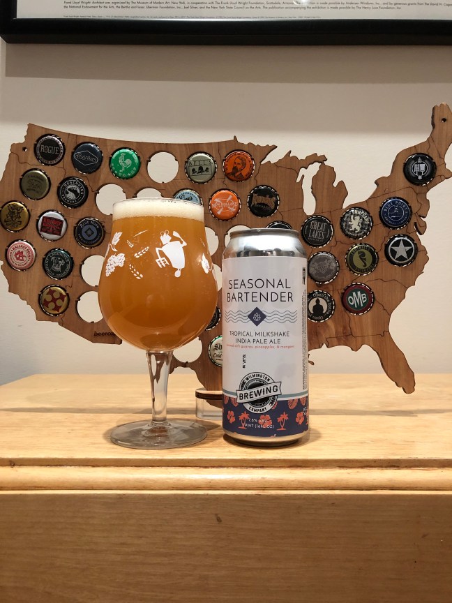 Willmington Brewing Company Seasonal Bartender Tropical Milkshake India Pale Ale, 7.8% ABV purchased locally from Pop the Top Bottle Shop is brewed with Pale malts, flaked wheat, oats Carapils, Lactose sugar, Azacca, and Chinook hops, dry hopped first with Ekuanot then dry hopped with Mosaic and Amarillo. Seasonal Bartender is brewed with guavas, pineapples and mangos in Willmington, North Carolina and pours an hazy yellow orange juice color with a two finger off white heads that slowly fades into wonderful lacing giving off sweet juicy tropical fruit notes with a slight cream scent that take you to a sweet juicy flavor with touches of bitterness and some creamy notes with a nice cream bitter juicy fruit finish and a similar aftertaste that linger a bit with a creamy medium mouthfeel. This Milkshake IPA is a relatively (2-3 years) new fad within craft beer and one that is slowly growing within. The whole IPA style and Willmington Brewing Company Seasonal Bartender Tropical Milkshake India Pale is a good beer, getting an A here. I find that the lactose does cut back some the hop bitterness so that isn’t a bitter punch in the face but at the same time, it not keeping and bitterness away from your taste buds. The lactose also brings out a sweetness within the fruity flavors adding a new layer of cream bittersweetness. Willmington Brewing Company Seasonal Bartender Tropical Milkshake India Pale is a beer that I recommend but not something that you can have more than two pints of seeing how the flavor is a bit stronger than some beers, but otherwise a great beer! Cheers! Please enjoy responsibly!