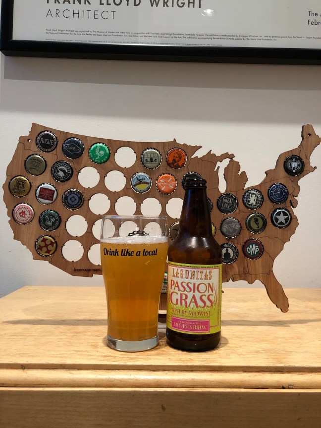 Purchased Lagunitas Brewing Company & Short’s Brew Passion Grass North By Midwest, 4.6% ABV from the local Harris Teeter grocery store. Passion Grass North By Midwest is a pale ale and pours a yellow color with a bright one finger white head that gives off very faint hop aroma with sour, tart grassy aromas that then lead into a bitter, sour, fruity lemon, tropical, grassy, flavor that finishes with a tart bitterness and a fruited tart bitter after taste with a light mouth feel. Lagunitas Brewing Company & Short’s Brew Passion Grass North By Midwest is not good I give this a F+. The tart sour flavor do not blend well with the bitterness of the pale ale. No it’s not good, it taste more like fresh fruit that has gone past it ripeness and is spoiling. No I don’t recommend that you try Lagunitas Brewing Company & Short’s Brew Passion Grass North By Midwest, it is bad but I did finish my twelve ounces and I will not go back to it! Cheers! Please enjoy responsibly!