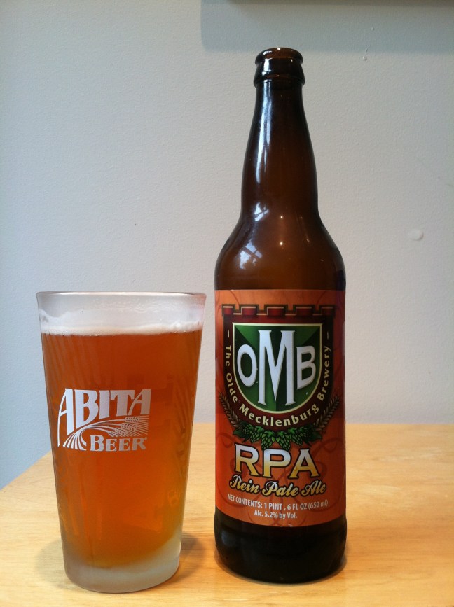 Yes my favorite brewery has been hard at work and here is a NEW brew RPA, no not Rye Pale Ale, this is Rein Pale ale, 5.2% ABV. This is a cross between an American pale ale and a German-style lagered ale. OMB brews this with a combination of four different American and German barly malt verieties, spicy American Tettnag and noble Czech Saaz hops. This OMB pours a beautiful light amber color with a thin-ish white head. You can really smell the Hop scent here on this with a nice grassy note. Smells just like a fresh hop field. Nice! This RPA has a moderately bitter taste about it. Not to much bitterness, just the right amout to make it great. Great for most any occasion. There is a very very faint spicy note on the finish along with a still moderate bitterness that finishes light and crisp. This beer is a good NEW brew for OMB and they have done it yet again, in making a awesome and tasty beer. I love this brewery and can not say enough good things about them. This RPA is part of small growing trend of hoppy/bitter beers that have been hitting the market recently, after the height of IPA crazy hit, which is now not so popular as it onces was. Now the trend is more toward less hop and more bitterness, but to much bitter and it sour which is the next trend I think. But this hit the trend make well with it’s hybrid American pale ale and German lagered ale. Great beer and I give The Olde Mechlenburg Brewery RPA, Rein Pale Ale an A+. Just the right amount of bitter in this one. Not too much, yet not too little. Good work OMB! Keep it up. I would by this again, have it over and over again, just like all the beers they brew. I love a good tasty OMB brew! Cheers! Please drink responsibly!