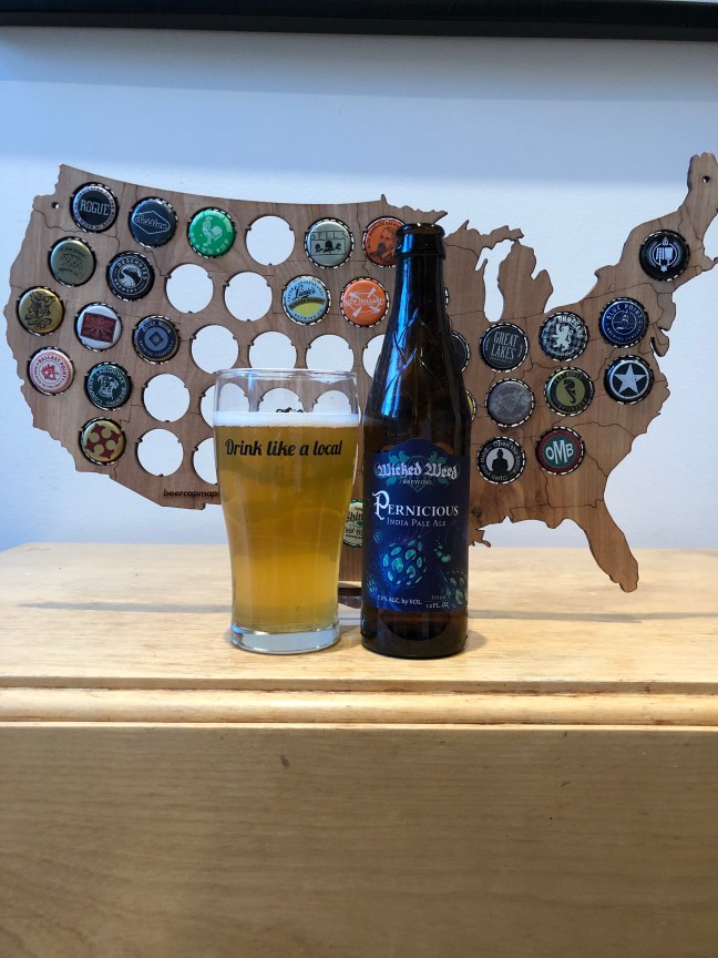 Picked up Wicked Weed Brewing Pernicious India Pale Ale, 7.3% ABV from the local Harris Teeter, this local brew is brewed in Asheville, North Carolina. Pernicious pours a yellow Pilsner like color with a slight hazy and a one and a half finger white head with a bitter lemon floral aroma with some grass pine faintly wafting in with a bitter taste of a slightly fruity lemony piney flavor with slime bitter hoppy notes in the middle and toward the back of the mouth with a clean finish that slowly smooth out bitter in the aftertaste that has a very light lemon flavor with a lighter mouthfeel. For a beer that 7.3% ABV Wicked Weed Brewing Pernicious India Pale Ale is easy to drink and is good getting a B+ here. I think that Pernicious could use more hops to give it the hoppy notes more of impact on you taste buds but other than that is good and you should try it! Cheers! Please enjoy responsibly!