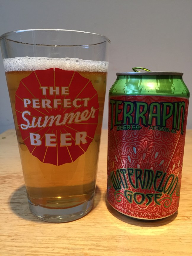Gose (Goes-uh) is a traditional German-style beer brewed with sea salt and coriander. Gose is a making a come back especially with craft beer breweries and brewers. It is more of a summer type of beer, but I think it is good any time of the year. One of my favorite breweries Terrapin Beer Co. in Athens Georgia brews Watermelon Gose, 4.5% ABV. Watermelon Gose pours a clear darker golden color with a fast fading two finger head of brilliant white. The aroma is tart and there is a nice watermelon fragrance with a faint hint of coriander. Taste is somewhat sweet with watermelon up front with a bit of salted tart flavor, but then as it passed over your tongue it the beer become a more tart. Nothing that is overly tart though. The mouthfeel is light and refreshing and Watermelon Gose has a tart watermelon finish with a tart but salty watermelon after taste that is more tart than anything else. Terrapin has done a good job her adding watermelon to an already tropical beer, but the finish and aftertaste are a little too tart. So with that in mind, I give Watermelon Gose a B-. I do think you should try this one, and I am not saying that the finish and aftertaste kill the beer and make it undrinkable, no that is not it at all; it’s just a little more than I would have liked it to be that’s all. I would have this again but it’s not a go-to beer. I liked Terrapin Beer Co. Watermelon Gose. Cheers! Please enjoy responsibly!