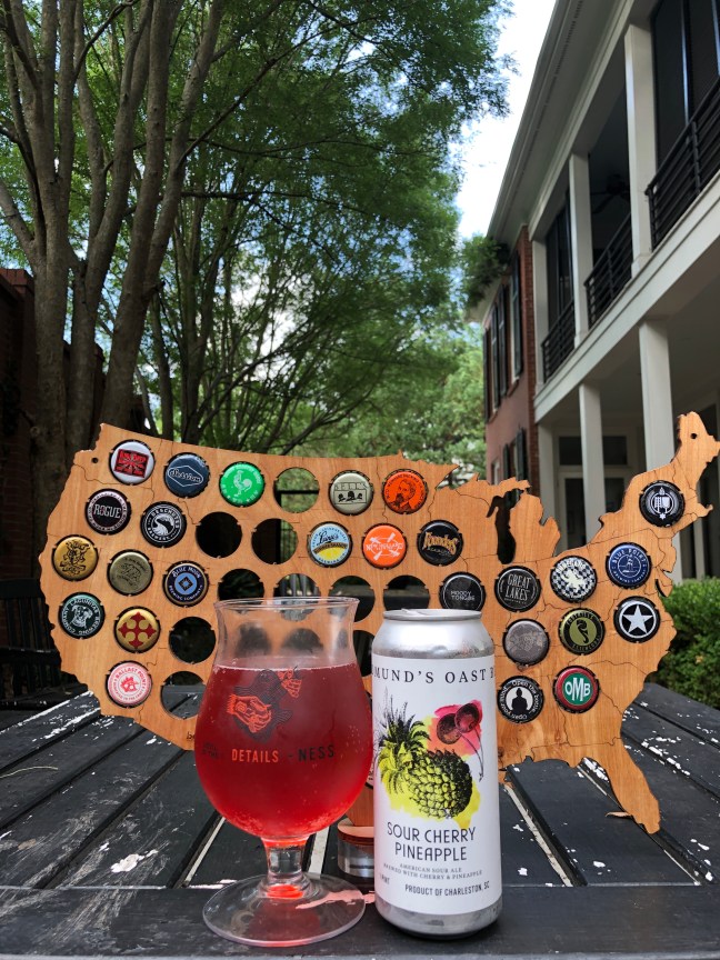 This Edmund’s Oast Brewing Co. Cherry Pineapple, 6.5% ABV is an American Sour Ale from Charleston, South Carolina I picked up from Pop The Top Craft Beer Shop. Sour Cherry Pineapple pours a Robitussin bright red color with a thin one and a quarter pink head that quickly fades into itself, with big sour tart cherry fruits. Smells okay but no pineapple. The flavor is similar to the aroma with tart and sour cherry with a very light/faint tropical note on the middle of the tongue still no pineapple then you get a sour cherry cough medicine that slowly fades into an effervescent tart Maraschino Cherry finish with a tart sour sugar cherry aftertaste and a light mouthfeel. I found Edmund’s Oast Brewing Co. Cherry Pineapple to have a weird cherry flavor without getting any pineapple with a medicinal quality to it. I give Edmund’s Oast Brewing Co. Cherry Pineapple a D-, I did finish this and it was not very heavy or way too sour, but not very good otherwise so do not try this! Please enjoy responsibly!