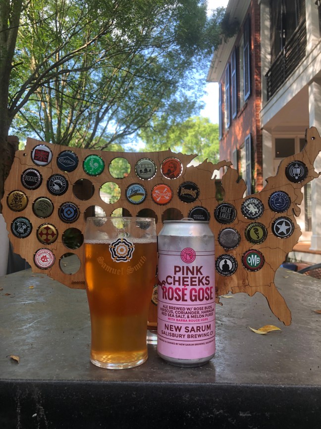 New Sarum Salisbury Brewing Co. Pink Cheeks Rosé Gose, 5.0% ABV local brewed in Salisbury North Carolina is brewed with Rosebuds, Hibiscus, Coriander, Hawaiian Red Sea Salt, melon purée and Barba Rouge Hops. It has a lot going on. Pink Cheeks pours a light orange somewhat copper color with a one finger thin white head that has briny salted aromas with a light fruity sweetness that has a tart aromatic quality to it. You get a salted briny sweetness that is light and fruity with a tartness around the middle and the back of the mouth with a faint floral note that all finishes with a tart fruity floral note and a salty fruity aftertaste with a nice bit of tartness and a light mouthfeel. I think the rose buds on this on not something I like, I’ve had beers with that ingredient in them before and I’ve had similar feeling toward them, but everything else about New Sarum Salisbury Brewing Co. Pink Cheeks Rosé Gose is okay, getting a C. Pink Cheeks is average, and the rose flavors held it to a C. It is something I would have again but not soon and if your curious then maybe you should try it! Cheers! Please enjoy responsibly!