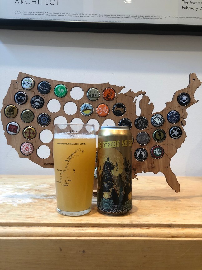 Burial Beer Co. Beyond The Fields, We Know Pale Ale, 5.8% (purchased from Pop The Top) is a collaboration between Burial Beer Co. and the band Dead Meadow and is double dry-hopped with Citra, Comet, and a big dose of Columbus Cryo hops. Beyond The Fields, We Know Pale Ale pours a bright cloudy yellow color with sediment floaters and a two-finger quickly fade-in white head, with big bitter grapefruit and hoppy aromas that is a nice and juicy on the nose. The taste is quite bold with a juicy bitter grapefruit orange with the growth of bitterness on the back of the tongue/mouth with a bitter citrus finish and a dank bitter aftertaste with a fuller mouthfeel. This is a wild pale ale that is nearly an IPA and Burial Beer Co. Beyond The Fields, We Know Pale Ale is a B- beer. It has a good wallop of hoppy bitter citrus flavor that is good but I not for more than two pints. If you like hoppy bitter citrus IPA like Pale Ales than Burial Beer Co. Beyond The Fields, We Know Pale Ale is one you should try. Cheers! Please enjoy responsibly!