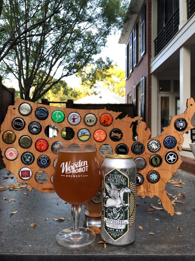 Flying Machine Brewing Co. Breakfast With Pegasus Hay Ale, 5.5% ABV is brewed in Wilmington North Carolina as part of their Collaboration Series with Edmund’s Oast Brewing Co. in Charleston South Carolina. Breakfast With Pegasus is brewed with vanilla, Lactose and Tiffany Hay which is dry hay that thrives in the warm seasons. Breakfast With Pegasus pours a hazy orange color with one finger quickly fizzing white head with sweet vanilla aromas with some nice cream notes. The flavor is of vanilla sweetness that is creamy with no hay notes present that finishes sweet and slightly sticky with a vanilla candy-sweet aftertaste with a medium mouthfeel. Flying Machine Brewing Co. Breakfast With Pegasus Hay Ale is definitely an interesting beer style. I give it a B- After two pints the sweetness begins to be too much on your pallet, and it’s more on a dessert side of sweetness. Yes, I would have this again as well as recommend it. Please enjoy responsibly! Cheers!