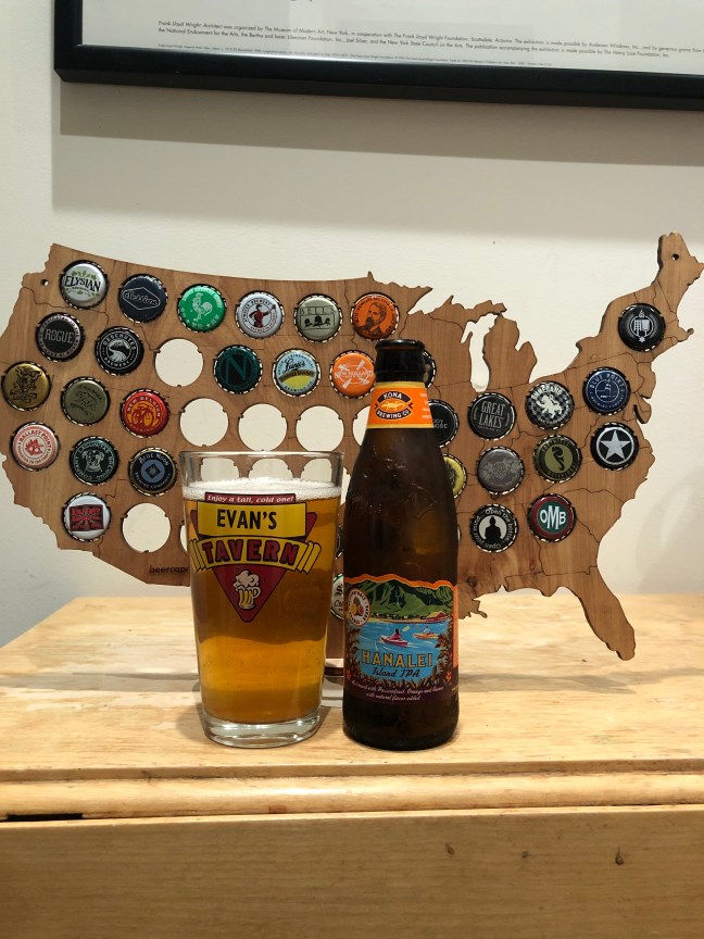 Kona Brewing Co. Hanalei Island IPA, 4.5% ABV with 40 IBUs is brewed in Kona Hawaii with Pale, 2 Row Premium, Carmel-120 malts, Azacca, Galaxy hops, Tropical Passionfruit, Orange, and Guava. Hanalei Island IPA pours a clear golden color with a one and a half finger white head that give tropical fruit aromas of passionfruit, guava, and some light orange. Taste of Hanalei Island IPA is a little similar to its nose with tropical fruits, guava, passionfruit and a little faint orange with a slight bitter hoppy note come through on the back of the tongue that does carry into the finish where the tropical fruit flavors fade into a light hoppy aftertaste with a light mouthfeel. Kona Brewing Co. Hanalei Island IPA is more tropical fruit than traditional IPA. I think that Kona Brewing Co. Hanalei Island IPA is an A-, the hoppy notes only chime in towards the back of the mouth and in the finish and aftertaste with drops it just slightly, and with that said this IPA is one beer I’d recommend trying. Please enjoy responsibly! Cheers!