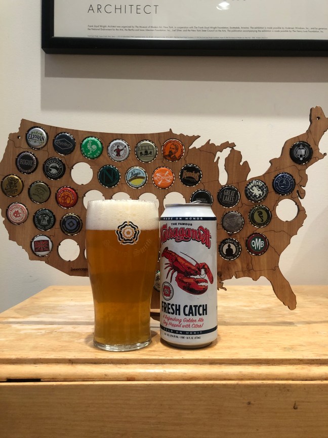 Narragansett Brewing Company Fresh Catch, 4.2% ABV is a golden ale dry-hopped with Citra hops in Pawtucket, Rhode Island which was founded way back in 1890 in Cranston Rhode Island. Narragansett is the best selling New England beer and has the ad slogan “Hi Neighbor, have a ‘Gasnett!” and in 2012 for Shark Week the had a slogan “Crush it like Quint” and “Honor the man, crush the can on social media. If you know Jaws then you know Robert Shaw as Captain Quint. Fresh Catch pours the slightest deep yellow with a bright two finger white head that fades really slow with thick lacing left in its wake that might hide a shark. You get a nice citrus fruit aroma with a nice dose of a bitter hop note and a faint lemony grapefruit. The aroma reminds me more of a light IPA. Take a swig and you’ll find yep citrus fruit with a little faint biscuit note with a lemony bitter hop note that comes to a bitter crisp Citra finish that flows into a nice bitter citrus fruit aftertaste with a light mouthfeel. Narragansett Brewing Company Fresh Catch is a refreshing beer that I give an A-. Now I don’t think that more than three Fresh Catches can be consumed, after the third the flavor begins to become slightly too much. Its others a good beer and one that would pair well with shellfish, and a seafood boil. I recommend Narragansett Brewing Company Fresh Catch. Please enjoy responsibly! Cheers!
