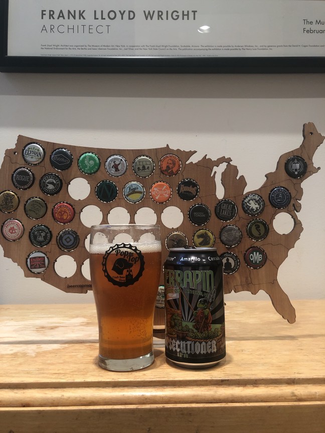 Terrapin Beer Co. Hopsecutioner IPA, 7.3% ABV purchased in a six-pack twelve-ounce can form from my local supermarket is brewed in Athens, Georgia with Warrior, Chinook, Simcoe. Amarillo, Cascade, and Centennial hops yeah that’s six different hops verities. Hopsecutioner pours an orange color with a two-finger white head that fades into a thin cloud on top. This IPA has dank garlic and onion aroma with nice hoppy bitter notes that then invite you into a taste that follows the nose with garlic and onion bitter hop notes that don’t overwhelm your palate. Hopsecutioner finishes with a nice hoppy malt flavor and comes to a nice bitter dank aftertaste with hints of very faint garlicky fruit notes all with a medium mouthfeel. Terrapin Beer Co. Hopsecutioner IPA is surprisingly good for an IPA that sounds like it to be a real wallop of hops to your tastebuds, it defiantly hopped and I give this an A. For have six varieties of hops it has a bit of smoothness about and I if you like classic styles IPA then this is right up your alley. Please drink responsibly! Cheers!