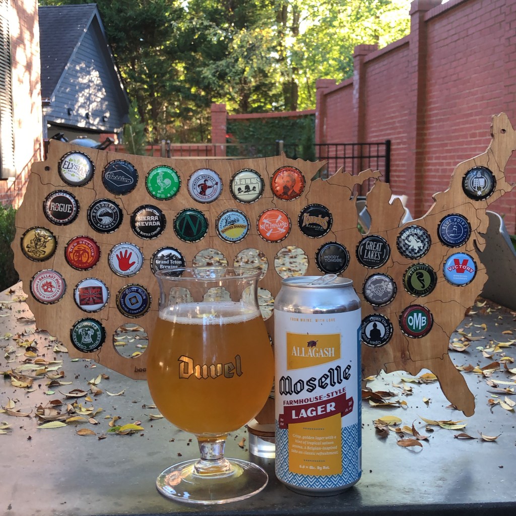 I purchased Allagash Brewing Co. Moselle Farmhouse-Style Lager 6.0% ABV from The Butcher’s Market not far from me here in South Charlotte, NC. Moselle is brewed in Portland, Maine by Allagash Brewing Co. circa 1999 with Northern Brewer, Hallertau hops, Pilsner malt, Vienna Malt, Munich Malt, local oats, Lager and Saison yeast. Moselle pours golden with a two finger stead fading white head that leaves behind bare minimum of lacing behind. The aroma is complex for a lager with a slightly funky tropical aroma with a nice tropical taste with faint yeasty breaded notes some sweetness with a bit of Saison flavor to the beer with a nice medium mouthfeel that finish with a funky tropical sweetness and carries the tropical nature into the aftertaste. Allagash Brewing Co. Moselle Farmhouse-Style Lager is an excellent beer that is refreshing and crisp that gets an A+. I’m not surprised that Allagash Brewing Co. brewed such a great beer and one that I highly recommend. Please stay safe and enjoy responsibly! Cheers!