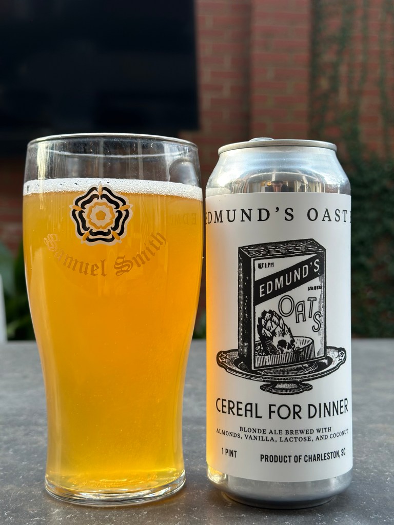 I first reviewed this beer, Cereal For Dinner, back in 2020 at the end of May. I thought I would review this beer again because I keep seeing this everywhere. This beer is by Edmunds Oast Brewing Co. in Charleston, South Carolina. This beer comes in at 5.5% ABV and has almonds, vanilla, Lactose, and coconut. This ale pours yellow with a two-finger steady head. The aroma is vanilla-sweet and nutty. The flavor is also vanilla, coconut, and smooth. The flavor of this beer is nutty but slightly nuttier than its aroma. This beer feels light on the mouth. Then you come to a finish of sweet vanilla nuttiness with some fake or artificial coconut. The aftertaste is sweet and nothing more. This beer is not overly sweet overall. That’s good because blonde beer that is sweet shouldn’t be. This ale has the right amount of sweetness with a bit of a nutty flavor. I give Cereal For Dinner a B+. This beer has plain vanilla and not a more exotic type of vanilla. If it did, I would probably rate this higher. I recommend that you drink this beer. It is good. This beer is good enough to have a few. Please stay safe, be kind to each other, and remember to enjoy responsibly! Cheers!