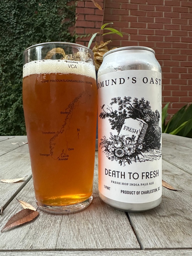 Death To Fresh is a fresh hop India Pale Ale from Edumnd’s Oast Brewing Co. in Charleston, South Carolina. This beer is 6.3% and has fresh hops picked in the prime and shipped across the county. A fresh hop IPA is an IPA that uses whole cone hops off the hop vine instead of dried hops. This beer pours a deep orange with a two-finger steady white head. The aroma is bitter, citrusy, floral, and earthy. The flavor is bitter, clean, dry, earthy and citrusy. This reminds me of Sierra Nevada’s Celebration. Then, this IPA comes to a clean and bitter citrus finish with a citrusy bitter aftertaste. This isn’t as bitter as Sierra Nevada’s Celebration. I give Fresh To Death an A-.It is not an intensely bitter fresh hop IPA but a good one. This isn’t brewed to be a staple, but it is almost like a seasonal beer. From what I got on the brewery website, it’s brewed here and there. I would recommend this if you are into this style. I would go for this again. Please stay safe, be kind to each other, and remember to enjoy responsibly! Cheers!