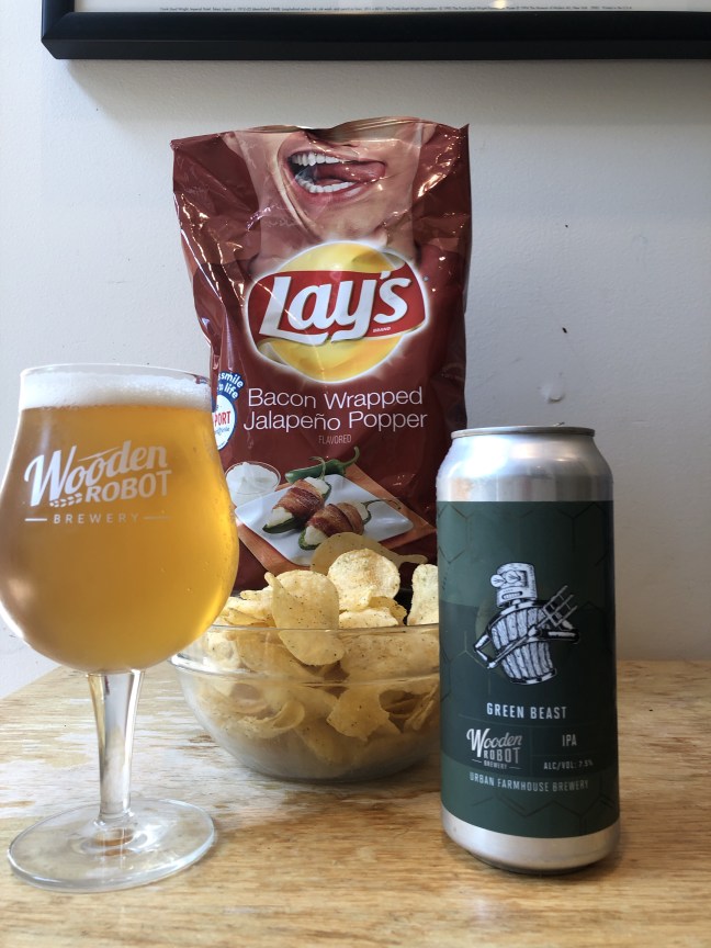 I picked up both Terrapin Beer Co. Hopsecutioner IPA, 7.3% & Cheetos Crunchy Simply white Cheddar Jalapeño from my local grocery store. I will be reviewing Hopsecutioner soon. Cheetos Simply Cheddar Jalapeño are made with real cheese and are more of a light yellow color than the normal bright orange Cheeto color. They are long and knotted with a minimal cheese dust/coating, and they had a nice cheddar aroma with light jalapeño spice to them. The flavor is light on the jalapeño and you get more cheese, cheese hits your taste buds followed by the light jalapeño flavor with a good crunch, that comes together for a light spicy cheddar finish and very similar aftertaste. When the Cheetos are paired with Hopsecutioner the hoppy flavors carry the spicy notes well giving them a leg up in the flavor department and slightly mask the cheddar flavor and washes it out a little bit in the finish giving you am added hoppy not to the Cheetos aftertaste. Overall these Cheetos Crunchy Simply White Cheddar Jalapeño are not too bad getting a B- & as pairing with Terrapin Beer Co. Hopsecutioner IPA it’s also a B-. The chips fall short with jalapeño flavor, needs a little more, and the cheddar does get a tiny bit lost in the IPA hop notes. But I would not turn these two down if I was offered. Please enjoy responsibly! Cheers!